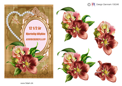 Ramme med tekst “hjertelig tillykke kobberbryllup” og brune blomster